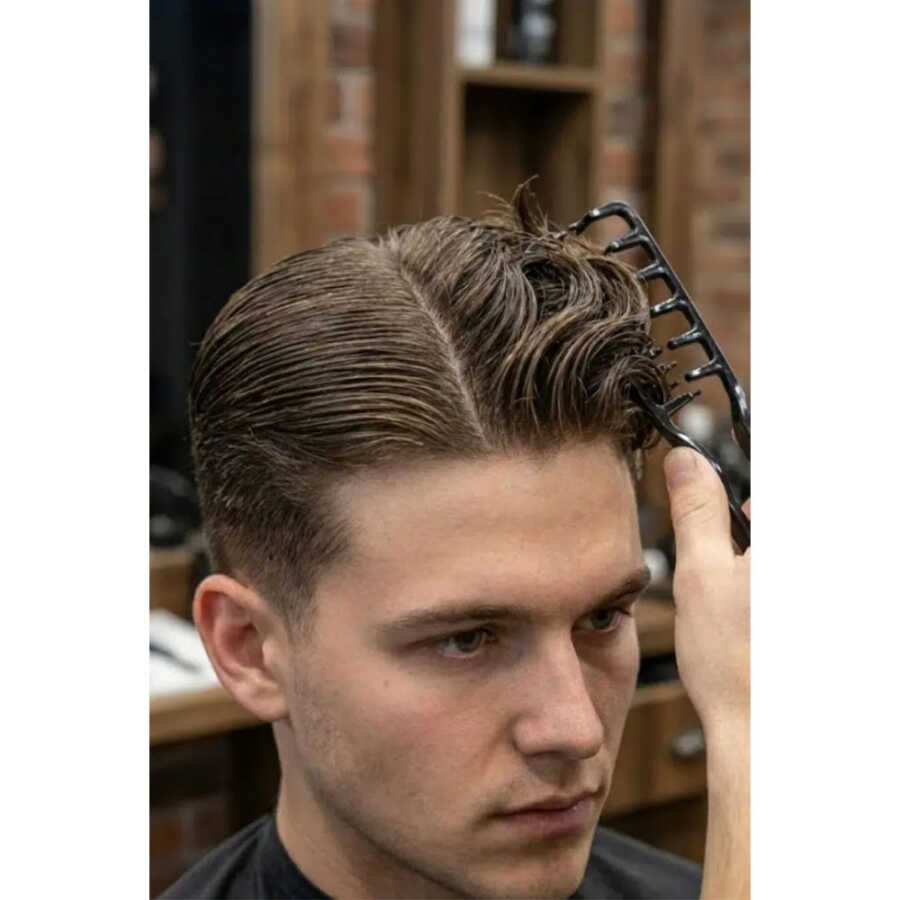 Temiz saça şekillendirici ürün (wax, jöle, pudra, köpük ...vb) sürdükten sonra tarakla dilediğiniz formu verin